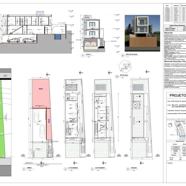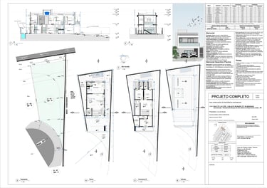 Foram produzidas todas as peças técnicas exigidas para a aprovação do imóvel residencial, incluindo planta baixa, planta de situação, planta de cobertura, cortes, fachadas e detalhes construtivos. Também emitimos a Anotação de Responsabilidade Técnica (ART), assegurando a validade técnica e profissional do projeto.